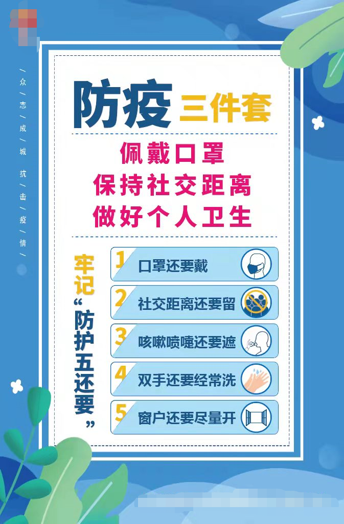 防疫“三件套” 防护“五还要” 一定要记牢! 2022-03-21 11:24信息宣传科 请从我做起,从身边小事做起 坚持“防疫三件套”,牢记“防护五还要” 为早日彻底战胜新冠疫情提供有力保障! 图片来源于网络