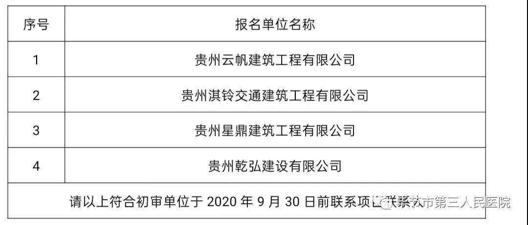 截止到2020年9月29日下午18:00,前来我院参与报名的单位总共有七家单位,经审查小组初步审查,报名资格审查合格的四家单位如下:(排名不分先后)