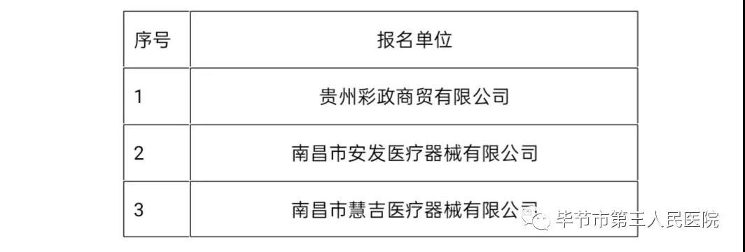 三、报名初步审查结果:截止到2020年11月10日下午18:00,前来我院参与报名的单位总共有3家单位,经审查小组初步审查,报名初步审查合格的三家供应商如下:(排名不分先后)