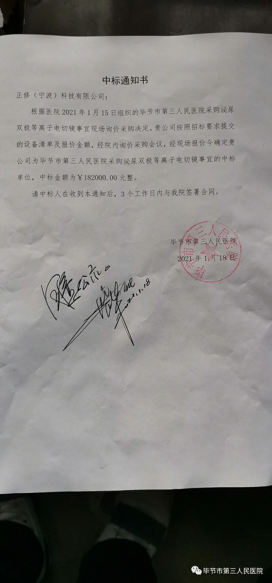 中标(成交)通知书【毕节市第三人民医院新院区DSA机房移机前钢结构轨道及设备配套设施项目】